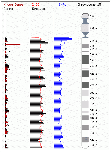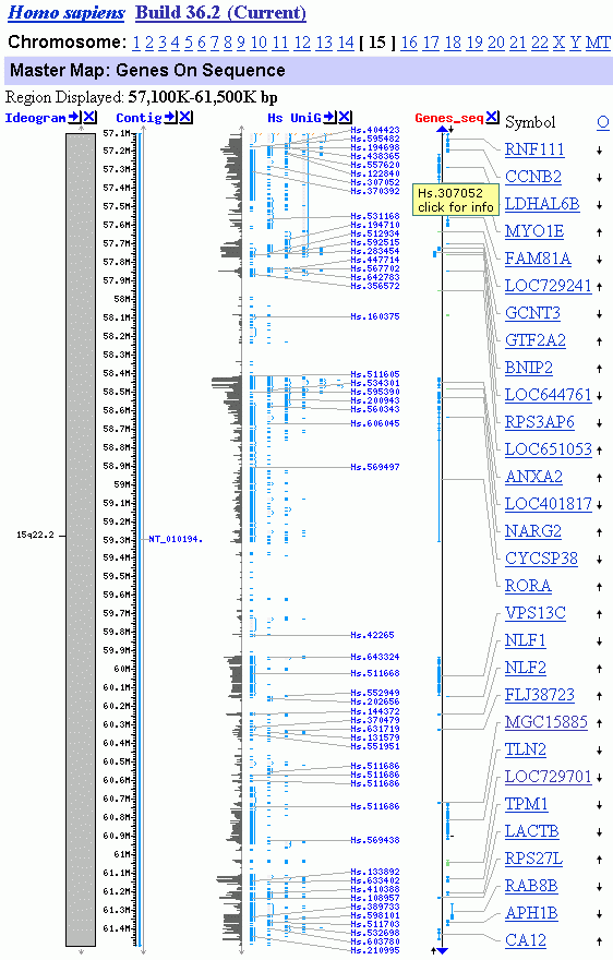 Region Displayed: 15q22.2 Region Displayed: 57100K-61500K bp Total localized Genes On Chromosome: 1143 Genes Labeled: 30 Total Genes in Region: 42