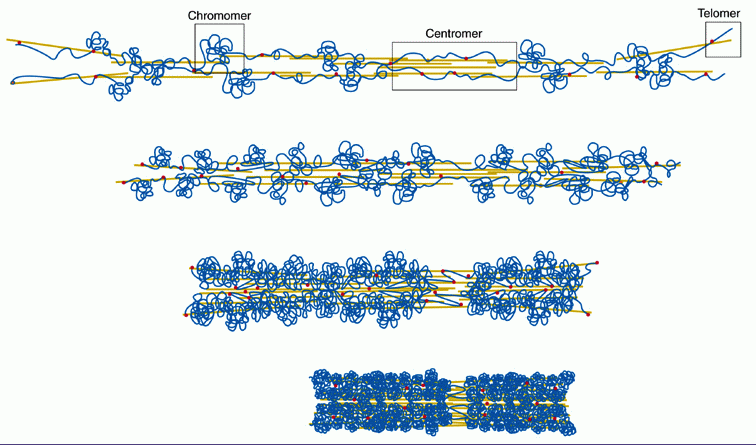 Wie auf der Abbildung „Scheme of condensating chromatin to structures of higher order” (oben rechts) und der Übersicht über das Band 15q22.2 zu sehen ist, sind weder Chromatin-Subdomänen, noch Chromatin-Domänen bzw. Chromomere Einheiten gleicher Größe: damit kommen zumindest für mich Chromosomenmodelle, die eine regelmäßige Periodizität von Chromatin-strukturen erfordern, nicht in Betracht. Das betrifft sowohl das sogenannte radiale Schlaufenmodell (Adolph und Kreisman, 1985), als auch das „Mehrfachschrauben-modell“ (multiple coiling model) von Taniguchi und Takayama (1968) und die sogenannten „helikalen“ Chromosomenmodelle (scaffold model) von Filipsiki (1990), Laemmli (1994) und Stack und Anderson(2001).