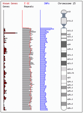 Die Abbildungen (Quelle: NCBI) zeigen das Chromosom 15 und einen Teil seines langen Arms mit dem Chromosomenband q22.2. In diesem Band liegt das TPM1-Gen (Tropomyosin-alpha), das ich ins Zentrum meiner Untersuchungen gestellt habe.