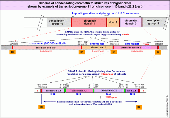 Das humane Genom ist hierarchisch organisiert. Diese Organisation wird von Architekturproteinen und SMARS übernommen. Es scheint logisch, dass ein Chromosomenband aus maximal 23 Transkriptionsgruppen (gleich der Zahl der verfügbaren Nukleosomengrössen) bestehen kann. Dass eine Transkriptionsgruppe maximal 5 Chromatin-Domänen/Chromomere zählen kann, ist eine Schätzung, die sich an der durchschnittlichen Grösse der Transkriptionsgruppen und der Domänen orientiert. Chromatin-Domänen wiederum – und das ist eine Annahme, die sich an der Zahl der Differenzierungsstufen orientiert, die eine Zelle vermutlich höchstens durchlaufen kann - können wahrscheinlich bis zu 10 Subdomänen enthalten. Um die Hierarchie dieser Strukturen und damit ihre Funktionalität während der Kondensation und Dekondensation des Chromatins im Verlauf einer Mitose zu erhalten, muss es zweifellos Sequenzen geben, die nicht nur diese DNA-Abschnitte gegeneinander abgrenzen, sondern auch ihre zeitlich und räumlich koordinierte Aktivierung oder Deaktivierung kontrollieren. Diese Sequenzen sind die sogenannten SMARs - sie offerieren Bindungsstellen für Proteine und Proteinkomplexe, die in proprietärer oder modifizierter Form in die Regulation der Chromatin-Kondensation und –Dekondensation, in die Bildung von Transkriptionsschleifen und die Formatierung von Chromatin-Domänen und damit in die Aktivierung von Promotoren und regulatorischen Proteinen eingreifen.