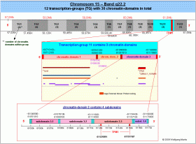 Die Abbildung unten links zeigt das Band q22.2 des Chromosoms 15. NCBI schreibt diesem Band dreissig bzw. 40 (Struktur-) Gene zu, was den tatsächlichen Verhältnissen ziemlich nahe kommen dürfte (diese Zahl hängt letztlich davon ab, welche Sequenzen man zu den Genen119 zählt (REMA-Gene, UsnRNA-Gene, ALU-Gene, andere interspergierte repetitive Elemente?). Im Band 15q22.2 habe ich mit Hilfe von IMPACD® zwölf Transkriptionsgruppen definiert, die ich auf der Abbildung mit TG1 bis TG12 bezeichnet habe. Diese 12 Transkriptionsgruppen repräsentieren insgesamt 30 Chromatin-Domänen.120 Die Transkriptionsgruppe 11, in der das TPM1-Gen liegt, habe ich genauer untersucht und durch SMARs in Chromatin-Domänen und darüberhinaus in Subdomänen eingeteilt. Die Subdomäne 3.3 – in der sich das TPM1-Gen befindet - werde ich in Teil III dieser Arbeit im Detail analysieren.