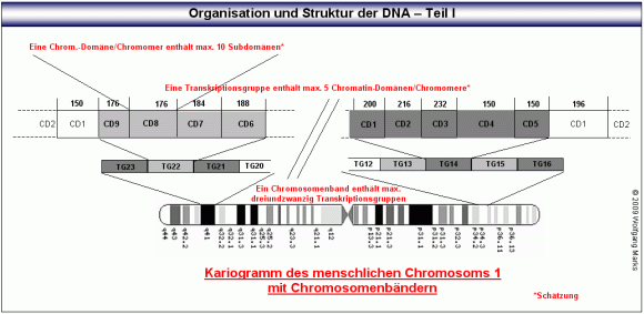 Chromosomenbänder, Transkriptionsgruppen, Domänen, Subdomänen. Dass die DNA eine innere Struktur, eine inhärente Ordnung hat, geht schon aus der Tatsache hervor, dass sie während der Mitose nicht als mehr oder weniger „zusammengeknäueltes“ Riesenmolekül an die Tochterzellen weitergegeben wird, sondern säuberlich verpackt in Form von 46 Chromosomen. Auch die Bänderung der Chromosomen ist ein Hinweis darauf, dass es unterhalb der Chromosomen-Ebene weitere Strukturen geben muss, welche die DNA in funktionelle Bereiche gliedern.